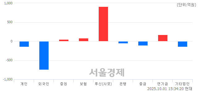 투자자별 동향을 살펴보면 기관은 1,036억을 순매수 했으며, 개인은 145억, 외국인은 746억을 각각 순매도 했다.